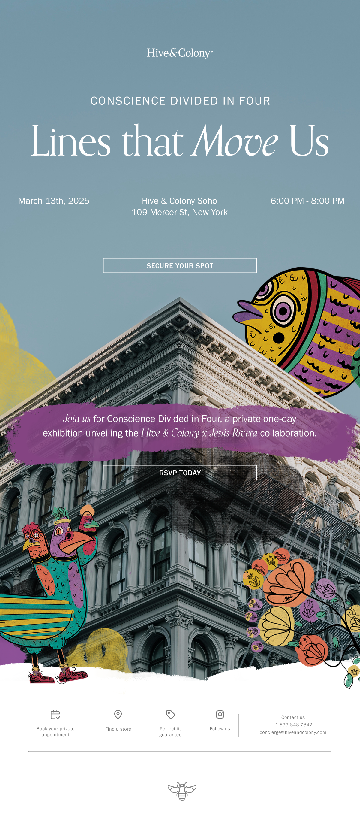 I led the creative strategy for Hive & Colony’s collaboration with visual artist Jesús Rivera, a 360° campaign to launch a limited-edition collection of custom suit linings, designed by Rivera in his signature urban-art style. The project included everything from the key visual and landing page to social content, newsletters, and an in-store experience at their NYC location. I oversaw the copy direction, content approval, and helped shape the launch event from planning to execution. The result was a fresh and artistic take on modern tailoring, featuring bold linings and limited to just 100 pieces, that brought individuality to the bespoke experience. The campaign had the highest engagement of the quarter, and the event became a space where fashion met art in a truly personal way.